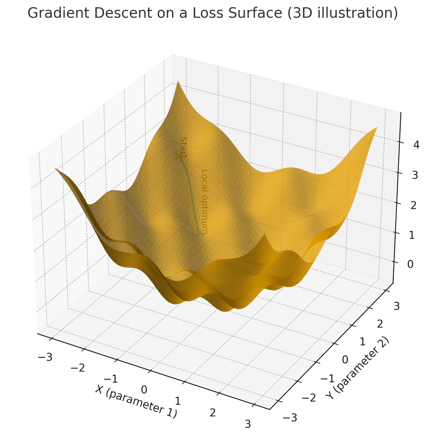 - 学习过程靠损失函数来引导。可以把损失函数想象成一个“地形超平面”,网络在其中“下坡”,不断调整参数,直到找到误差最小的位置(局部或全局最优解)。