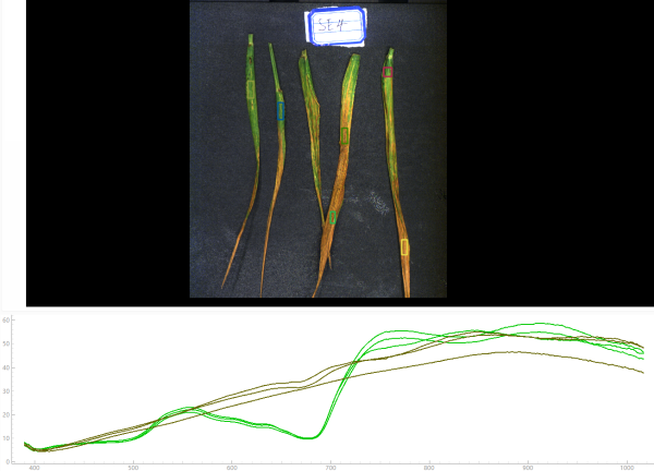 使用400-1000nm高光谱相机采集小麦叶片的光谱数据,计算小麦叶片NDVI植被指数,生成热力图,并通过NDVI指数进而反演小麦叶片叶绿素含量,助力农业植物生长检测。