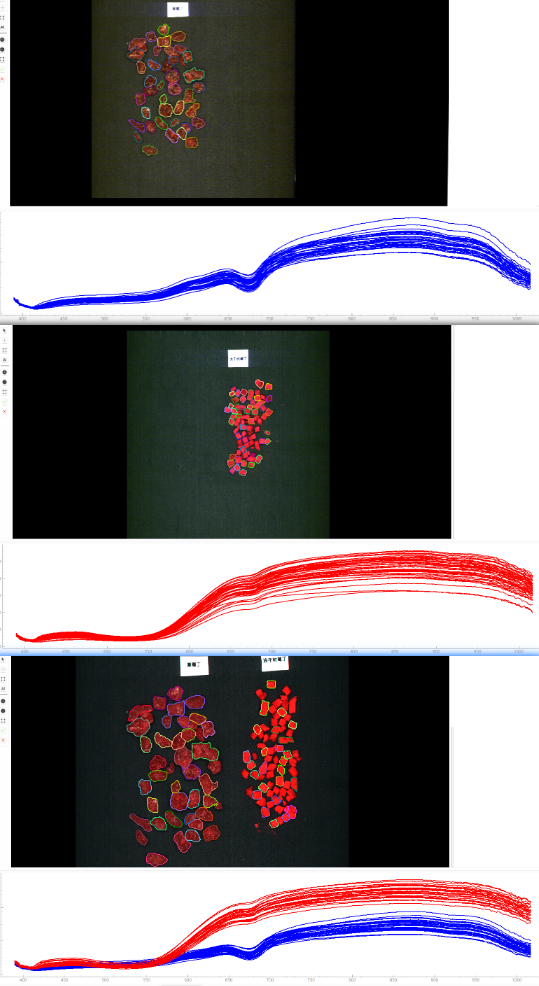 1、使用400-1000nm高光谱相机采集草莓丁和冻干树莓丁反射模式的光谱数据;